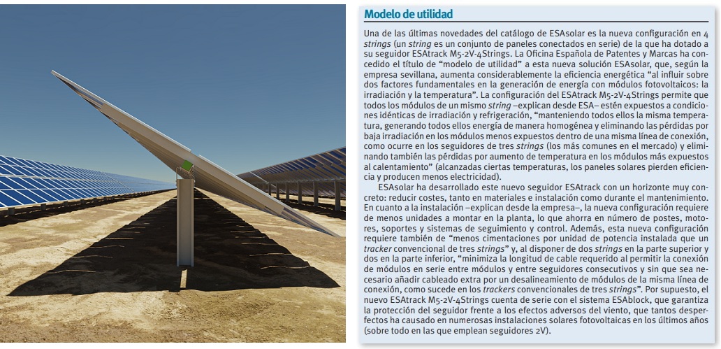 La empresa inicia en 2012 su segunda etapa, la de los seguidores solares, de la mano de los cuales sigue consolidando su posición en el sector. Hasta el punto de que hoy presume de haber instalado (entre estructuras fijas y con seguidor) más de quinientos megavatios en todo el mundo, un viaje de quince años que encuentra ahora su tercer hito clave: ESAblock*, el que presenta como “el primer sistema integral para proteger del viento los trackers de las plantas fotovoltaicas”, porque el viento, incluso a velocidades moderadas puede afectar y afecta a las instalaciones fotovoltaicas, hasta el punto de que puede “hacer volar” las placas y los seguidores solares (trackers).