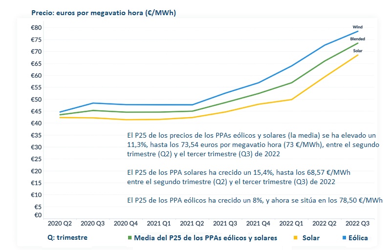 La demanda de acuerdos PPA de compra de electricidad de origen renovable se está disparando, porque la industria se ha dado cuenta de que puede utilizar estos contratos (de largo plazo y precio fijo) como herramientas efectivas para fijar los precios de la electricidad a 10, 15 ó 20 años vista, y evitar así sorpresas (pandemias, problemas logísticos de escala global, guerras...). Además, contratar un suministro de electricidad limpia (de origen renovable) beneficia a la marca contratante, en términos de imagen, de cara al público. LevelTen acaba de publicar su último informe sobre el particular, y este revela que el percentil 25 de los precios de PPAs solares y eólicos europeos ha aumentado más de once puntos en el tercer trimestre de 2022. O sea, que el megavatio hora eólico y solar se ha encarecido en un 11% en los últimos tres meses, hasta alcanzar los 73,54 euros (73,54 €/MWh). Eso sí, ese precio sigue estando muy, muy, muy por debajo del precio del megavatio hora en el mercado mayorista de la inmensa mayoría de los países europeos: 159 €/MWh hoy en Francia; 168,5 en Alemania; 175,8 en Italia...