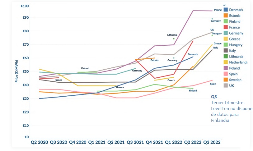 El informe del tercer trimestre de LevelTen, que abarca de julio a septiembre de 2022, muestra los precios y las tendencias de los PPAs en 16 países europeos: Dinamarca, Estonia, Finlandia, Francia, Alemania, Grecia, Hungría, Italia, Irlanda, Lituania, Países Bajos, Polonia, Rumanía, España, Suecia y Reino Unido.