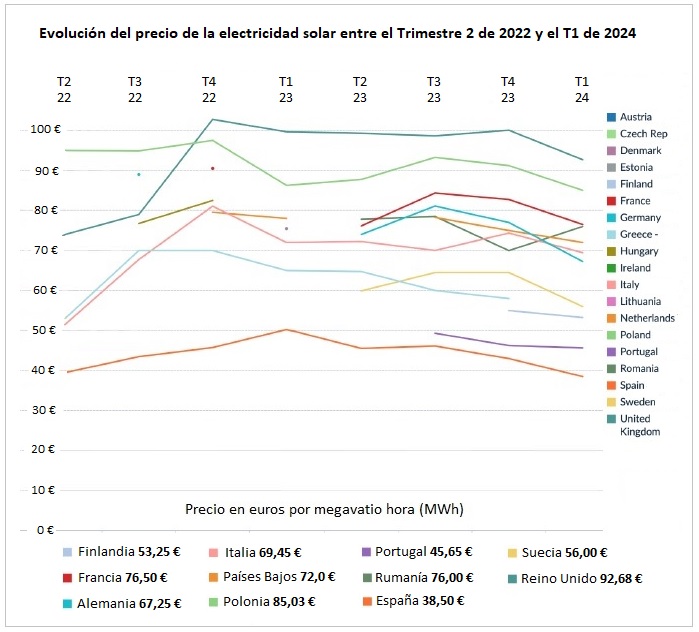 Algunos mercados han experimentado descensos de precios especialmente acusados en el primer trimestre: los precios P25 (percentil 25) han caído un 12,7% en Alemania; un 13,2% en Suecia; y un 10,5% en España. Por todos los motivos susodichos y porque la tecnología no cesa de abaratar sus costes. Los módulos solares fotovoltaicos son cada vez más baratos. Hace apenas unas semanas, Solaria, una de las grandes promotoras españolas de parques fotovoltaicos, anunciaba una megaoperación de compra, de 435 megavatios de módulos solares, “a un precio de 9,11 céntimos de euros por vatio a un fabricante de primer nivel”. Este precio –explicaba la compañía madrileña– supone “una mejora de un 2,15% con respecto a la última compra del mes de diciembre de 2023 y una reducción de un 71% con respecto a los precios de 2022”. Solaria instalará esos módulos en su megacomplejo FV Garoña, de setecientos megavatios, durante el año 2024, que ha proyectado en el entorno de la antigua central nuclear (que tenía por cierto una potencia de 460 megas).