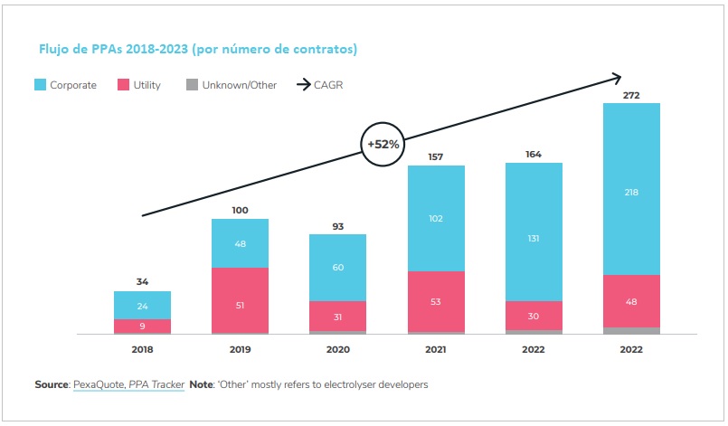 Según Pexapark, el año 2023 ha sido también el de los PPAs híbridos. El interés por hibridar renovables y almacenamiento ha aumentado “significativamente” en 2023, explican sus analistas, y ese interés también se ha manifestado en el mercado a través de la emergencia de los primeros PPAs híbridos para activos solares de gran tamaño carentes de subsidios. “La combinación de la creación de valor a partir de los servicios a nivel de red con la optimización de los ingresos a nivel de activos es el motor que impulsa el prometedor desarrollo de este modo de negocio”, sostiene el informe.