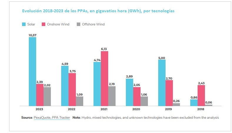 Si nos vamos más atrás del 23, y según los datos recabados por Pexapark, desde 2018, ha habido 28,4 gigavatios de PPAs solares (28.400 megavatios); 19,4 gigas de PPAs eólico–terrestres; y 6,7 GW de PPAs eólicos marinos. Pues bien, España es Top1 Solar indiscutible, con 14,2 gigas, muy-muy por delante del Top2, que es Alemania, con 3,6 GW. Por cierto, que, en lo que se refiere a eólica “terrestre”, España es Top2, con 3,8 gigas (solo por detrás de Suecia).