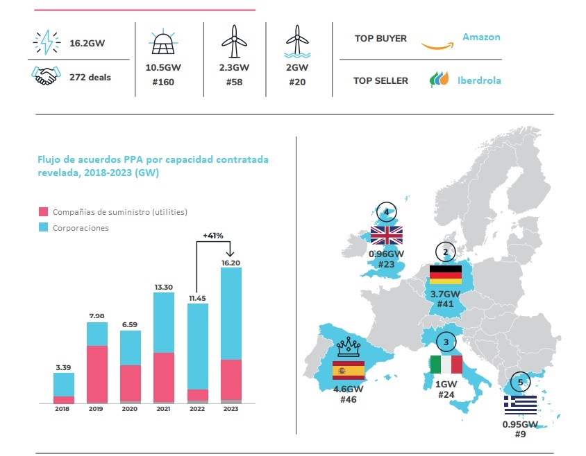 [Bajo estas líneas, Mercado Europeo 2023 de PPAs (power purchase agreement, contrato bilateral de compraventa de electricidad). El mayor comprador ha sido Amazon. El mayor vendedor, Iberdrola. Fuente: Pexapark].