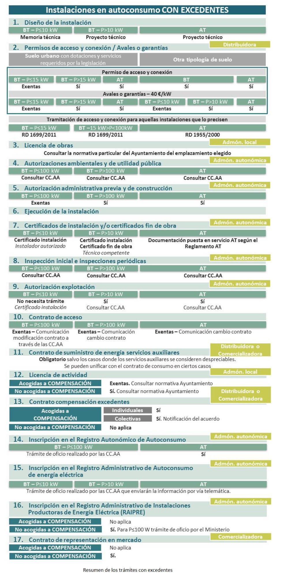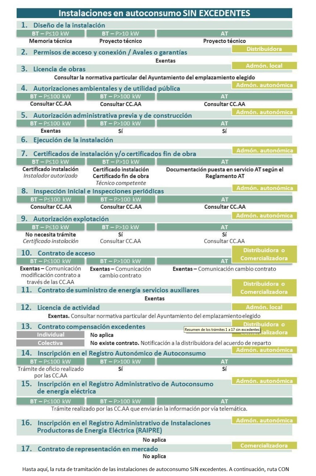 Energías Renovables reproduce a continuación sendos cuadros-resumen sobre las rutas de tramitación de las instalaciones de autoconsumo sin y con excedentes (Fuente: «Guía de tramitación del autoconsumo (versión preliminar)»).