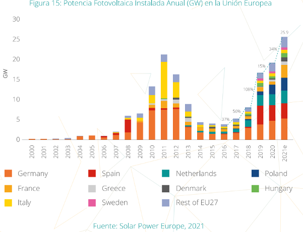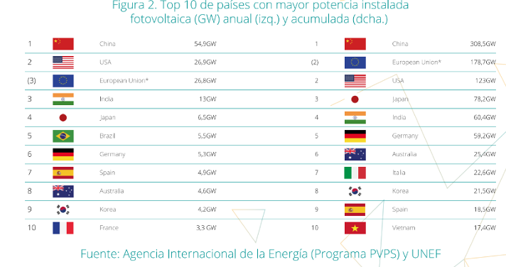 A nivel internacional la energía solar fotovoltaica, según señala la Agencia Internacional de la Energía (IRENA), ha sido la líder en 2021 de entre todas las tecnologías renovables y la más instalada a nivel mundial, alcanzando los 942 GW acumulados y creciendo un 21% respecto al año anterior. "Es la tecnología que más se instala en el mundo. Se espera que a futuro estemos creciendo alrededor de los 200 GW anuales", ha apuntado Rafael Benjumea, presidente de UNEF. Por países, China ha vuelto a posicionarse en 2021 como el mercado más dinámico del mundo. El gigante asiático se ha apuntado el 31% del total mundial. Concretamente, se han instalado allí 54,9 GW fotovoltaicos, frente a los 48 gigas de 2020. Tras China, se coloca Estados Unidos (26,9 GW), que supera el total instalado por los estados miembros de la Unión Europea (25,9). Los siguientes países del top 10 de países con mayor potencia instalada fotovoltaica son India (13 GW), Japón (6,5 GW), Brasil (5,5 GW), Alemania (5,3 GW), España (4,9 GW), Australia (4,6 GW), Corea (4,2 GW) y Francia (3,3 GW).