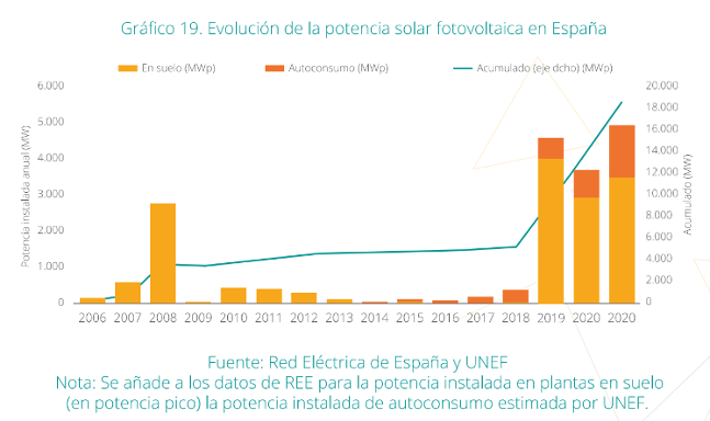 Y en España el boom fotovoltaico también es real y tangible. El 2021 fue histórico tanto en plantas en suelo con una capacidad instalada (3,5 GW) que creció un 21% frente a los 2,9 GW del 2020; como en autoconsumo con un crecimiento de más del 100% del año anterior. Y es que en 2021 se instalaron 1.203 MW y en 2020 la cifra quedó en 596 MW. En definitiva -según señala UNEF- "el año 2021 fue el mejor año de la historia del sector fotovoltaico en España". Rafael Benjumea, el presidente de UNEF ha defendido que la fotovoltaica "ayuda a reducir el precio de la energía eléctrica en España". Y lo que está en tramitación: 2,8 GW en construcción; 7,1 GW que se empezaran a construir que ya tienen autorización administrativa; 8 GW que ya cuentan con la declaración de impacto ambiental; y 62,3 GW que ya han comenzado los trámites. "Al menos en los próximos meses y como mucho en dos años estaremos introduciendo otros 15 GW nuevos", ha detallado José Donoso, director general de UNEF.