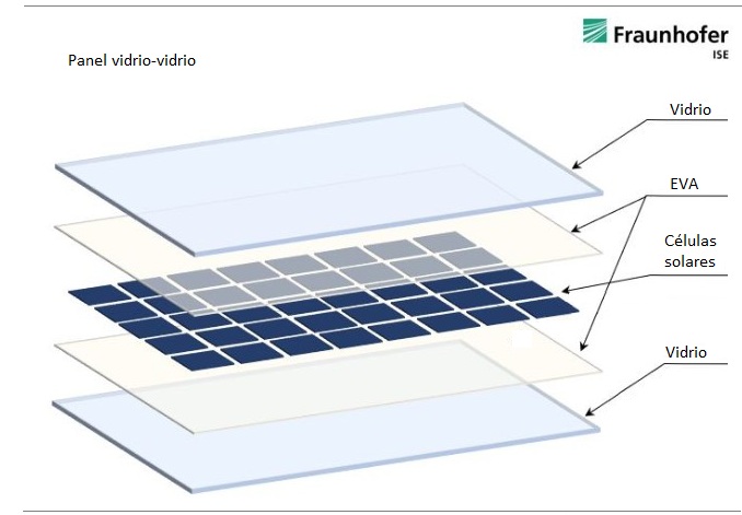 Dos hallazgos clave: -40% en emisiones de CO2, en primer lugar, y una merma adicional de emisiones (que oscilaría entre el 7,5 y el 12,5%) a favor de los paneles vidrio-vidrio, independientemente de dónde sean producidos, si los comparamos con los paneles de lámina de vidrio con marco de aluminio. Los módulos convencionales tienen vidrio por delante de la célula fotovoltaica (FV) y una lámina de plástico (más endeble que el vidrio, lógicamente) en la parte posterior. Los vidrio-vidrio son lo que parecen: vidrio por delante (antireflexivo) y vidrio por detrás, o células emparedadas entre vidrios. Los fabricantes de paneles vidrio-vidrio destacan, entre las virtudes de este producto, las siguientes: el vidrio no envejece; es resistente a la arena, a gases como el amoníaco (procedente por ejemplo de la degradación de los desechos animales), frente a la niebla salina y frente a las agresiones ambientales de la luz ultravioleta; y puede disipar la presión de las cargas de manera uniforme.
