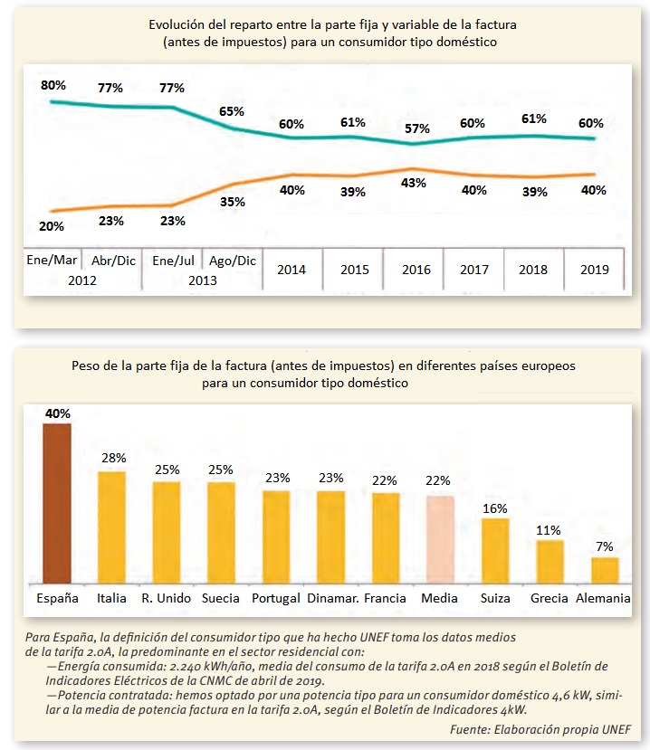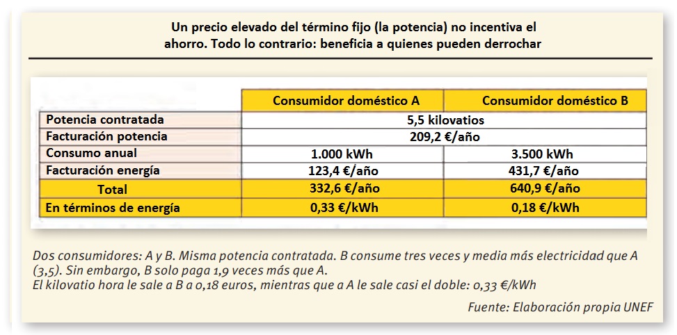 En nuestro país –concluye UNEF–, el reparto entre los términos fijo y variable de la estructura tarifaria actual es “consecuencia de sucesivas subidas del término de potencia que se produjeron entre 2012 y 2015” y que han producido una tarifa que envía “una señal incorrecta al consumidor”. Según UNEF, estas subidas “obedecían a un objetivo recaudatorio, que trataba de aumentar los ingresos del sistema para disminuir el déficit de tarifa; y a un objetivo de política energética, centrado en frenar el desarrollo del autoconsumo”.