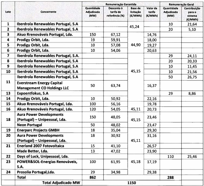 Portugal se comprometió a conseguir la neutralidad en carbono para 2050 como parte del esfuerzo europeo para combatir el cambio climático y en virtud del Acuerdo de París. Así lo establece el Plan Nacional Integrado de Energía y Clima de ese país. En el documento se enumeran ocho objetivos nacionales para 2030, entre los cuales se encuentra el objetivo 3 con el que se pretende reforzar la apuesta por las energías renovables y reducir la dependencia energética del país. Para aumentar la potencia nacional instalada de generación de electricidad con energías renovables, el país ha implementado un sistema de subastas de licencias para la producción de energía a partir de fuentes renovables, centrándose fundamentalmente en la energía solar. El Gobierno portugués realizó a finales de julio la primera de estas subastas. Entonces fueron adjudicados 1.150 megavatios. La competencia fue a la sazón feroz, y uno de los bloques fue adjudicado a un precio mínimo histórico: 14,76 euros por megavatio hora (véanse aquí todos los precios resultantes e identidad de los adjudicatarios). Uno de ellos fue Iberdrola, que se adjudicó 149 megavatios, lo que supuso además la entrada de la compañía en el desarrollo de este tipo de tecnología en territorio luso. La capacidad adjudicada por la compañía se distribuye en dos regiones (Algarve y en el valle del Tajo). La sociedad Prodigy Orbyt LDA, compañía portuguesa íntegramente participada por la española Solaria, también resultó adjudicataria (49 MW). En su caso, la adjudicación llevaba asociada la reserva de capacidad de conexión a la Red Eléctrica de Servicio Público y un régimen retributivo específico durante un plazo de 15 años, garantizando un precio fijo por la energía suministrada de 19,64 €/MWh.