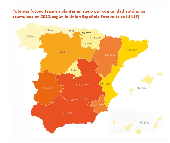 La demanda eléctrica de Cataluña en 2020 (último ejercicio cerrado) ha sido cubierta principalmente por fuentes nucleares, seguida por los ciclos combinados (11,8%) y en tercer lugar por la hidráulica (11,6%). La eólica cubrió un 5,7% de la demanda (un 16,3% menos que el año anterior); la fotovoltaica, un 0,86% de la demanda (un 7,7% menos que el año anterior), según el Informe de situación de 2020 del progreso de la implantación de energías renovables en Cataluña del Observatorio de las Energías Renovables en Cataluña (OBERCat), al que pertenece la delegación catalana de UNEF. Según Assumpta Farran, directora general de Energía de la Generalitat de Catalunya, para 2030 la Comunidad tiene el objetivo de lograr 3,5 GW fotovoltaicos sobre suelo y 2,1 sobre cubierta.