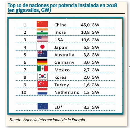 El año 2018 ha sido un año de récord. Por primera vez en la historia, el sector ha instalado (en solo doce meses) más de 100 gigavatios de nueva potencia solar fotovoltaica (FV). El parque FV global ha superado así los quinientos gigas (500 GW). Once países han sumado a sus respectivos parques solares nacionales más de mil megavatios (más de un giga). Así, cada vez son más las naciones embarcadas en la transición solar. Porque en 2017 solo fueron nueve los países que instalaron más de mil megas; y, sobre todo, porque en 2019 las previsiones apuntan a que serán 16 las naciones-giga, o sea, los países que cerrarán este ejercicio habiendo instalado más de mil megavatios de nueva potencia FV.