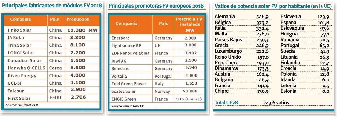 El Observatorio sitúa en 114.549 los megavatios que ya tiene el parque FV continental. Más de la mitad están en solo dos naciones: las muy soleadas Alemania y Reino Unido. En 2018, la locomotora del Viejo Continente ha conectado casi 3.000 megavatios FV. Muy activo ha estado también el mercado de los Países Bajos (1.400 megas). También ha funcionado a un buen ritmo Francia, que ha conectado 862. En total, como se dijo: 7.606 MW en 2018, frente a los 5.690 del año anterior. Según EurObserv’ER, esta recuperación demuestra que la transición que los grandes parques solares han experimentado hacia un modelo de mercado, sin ayudas, ya se ha completado. La caída de los precios de los módulos solares y la publicación regular de subastas en los principales mercados solares europeos (Alemania, Países Bajos, Francia) han sido responsables de ese “revival”, según EurObserv’ER, que también vislumbra un escenario brillante para el autoconsumo, dado el contexto de paridad de red en un número creciente de países europeos. Destacan en el informe, por fin, dos últimos datos: de entre los diez mayores fabricantes de módulos solares, ocho son chinos; de entre los diez principales promotores fotovoltaicos de Europa, ninguno es español.