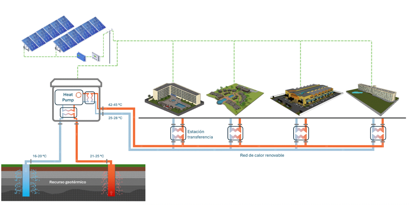 El primer proyecto que promueve ConnectHeat Costa Canaria es la construcción de una red de calor de baja temperatura con generación centralizada que integra bombas de calor de alta eficiencia, geotermia de muy baja entalpía y generación solar térmica y fotovoltaica para suministrar calor renovable.