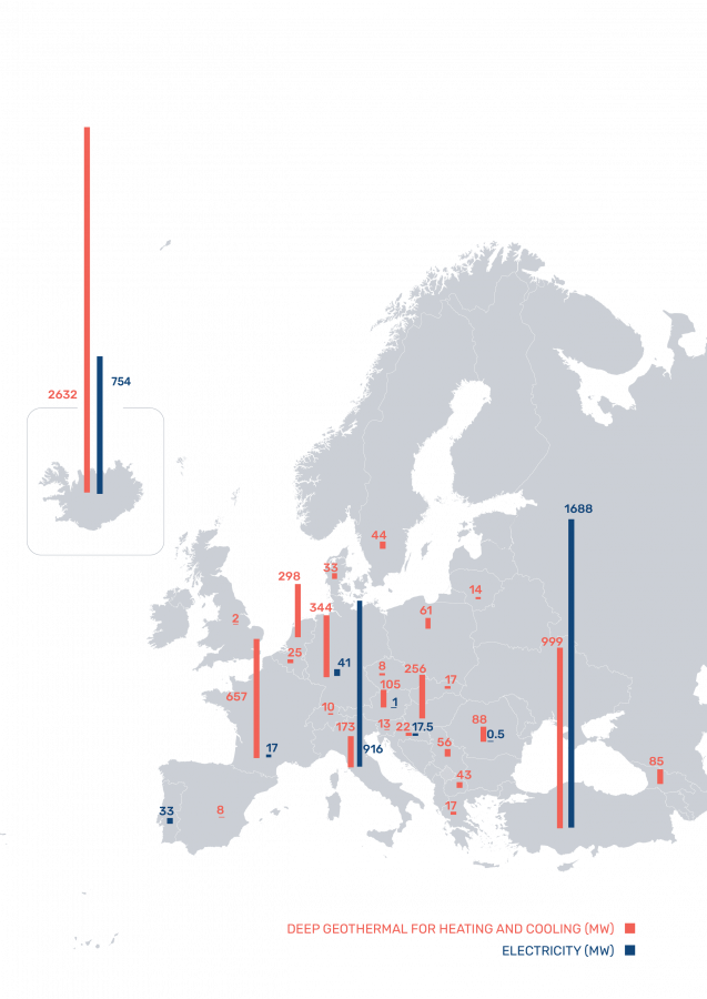 En climatización, la década pasada terminó con 350 sistemas geotérmicos de calefacción urbana en funcionamiento, y otros 232 en diversas fases de desarrollo. Sin embargo, el año 2020 se caracterizó por la ausencia de nuevos sistemas en funcionamiento, aparte de la ampliación de Hellishedi en Islandia. Aún así, el sector europeo de la calefacción y la refrigeración geotérmicas mantiene una tendencia positiva y la mayoría de los países quieren ampliar considerablemente el uso de este recurso renovable, ya que aplican políticas de descarbonización de la calefacción y la refrigeración.