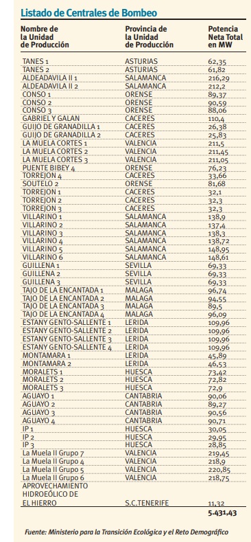 Según el Ministerio para la Transición Ecólógica y el Reto Demográfico, ahora mismo hay en España concretamente 5.431 MW de potencia en bombeos hidráulicos y vienen de camino (están en tramitación) 2.485 MW más. Estamos hablando de proyectos para los que se ha presentado al menos la solicitud de autorización administrativa previa. En todo caso, y según fuentes del Ministerio, hay más iniciativas: “muchos promotores tienen intención de desarrollar proyectos, pero aún no han comenzado la tramitación de la autorización de los mismos”. En todo caso, con los 2.485 megas que ya han presentado la solicitud de autorización administrativa previa ya alcanzaríamos el objetivo 2030 que, en materia de bombeo, fija el Plan Nacional Integrado de Energía y Clima: 8.000 MW. El negocio es rentable, a la vista está. Un bombeo es un almacén de agua con el que podemos generar justo cuando el precio es más elevado. Las grandes compañías lo saben y por eso lideran los proyectos más ambiciosos.