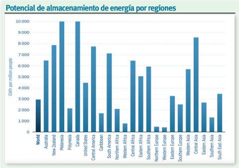 La mayor parte de la capacidad hidroeléctrica mundial se localiza actualmente en Asia (42%), seguida de Europa (17%), Norteamérica (15%), Sudamérica (13%), Eurasia (7%) y el resto del mundo (6%). En la mayoría de las regiones, las centrales de bombeo representan entre el 9% y el 13% de la capacidad hidroeléctrica total instalada; si bien este tipo de plantas está casi totalmente ausente en América Latina, donde suman menos de 1 GW.