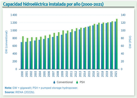 La energía hidroeléctrica convencional creció más de un 75% entre los años 2000 y 2021, haciendo que en la actualidad haya instalados en el mundo más de 1.230 gigavatios (GW) de capacidad. En ese mismo periodo también se disparó, en torno a un 50%, la capacidad instalada en centrales de bombeo (PSH), alcanzando los 130 GW operativos en 2021. La suma de unas y otras representa más del 50% de la capacidad mundial instalada en energías renovables. El potencial hidroeléctrico sin explotar es, además, enorme. De acuerdo con el informe ´The changing role of hydro power: challenges and opportunities` de la Agencia Internacional de Energías Renovables (Irena), si el mundo quiere descarbonizarse completamente y cumplir los objetivos climáticos establecidos en el Acuerdo de París, la capacidad instalada de energía hidroeléctrica, incluida la obtenida en centrales de bombeo, debería más que duplicarse para 2050, lo cual exige que las inversiones anuales en esta fuente de energía se tienen que multiplicar por cinco.