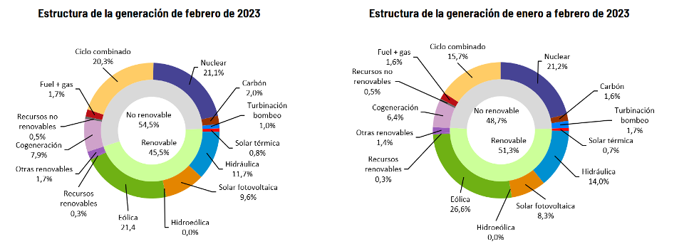Febrero ha terminado con una producción renovable de 9.929 gigavatios hora (GWh), es decir, un 45,5% del total del mix (alcanzando algunos días el 60%) y un un 20,5% superior a la del mismo mes de 2022. La tecnología que destaca es la hidráulica que, a pesar de que su participación en febrero no es la más alta (ha sido del 11,7% del total), sí ha aumentado este mes un 117,4% respecto al mismo mes del 2022, hasta alcanzar los 2.555 GWh. La eólica ha sido una vez más la fuente de energía líder del mes, con una producción de 4.662 GWh y una cuota del 21,4% del total. Y la solar fotovoltaica, con 2.095 GWh anotados en febrero, incrementó su producción un 23,7% respecto a la del año pasado, obteniendo una participación del 9,6% y consagrando su mayor producción en un mes de febrero. El total de energía fotovoltaica producida en los 28 días que tiene este mes es el mayor de los últimos cinco meses (septiembre de 2022), según informa Red Eléctrica. La producción del conjunto de tecnologías que no emiten CO2 equivalente ha significado el 67,2% del total.