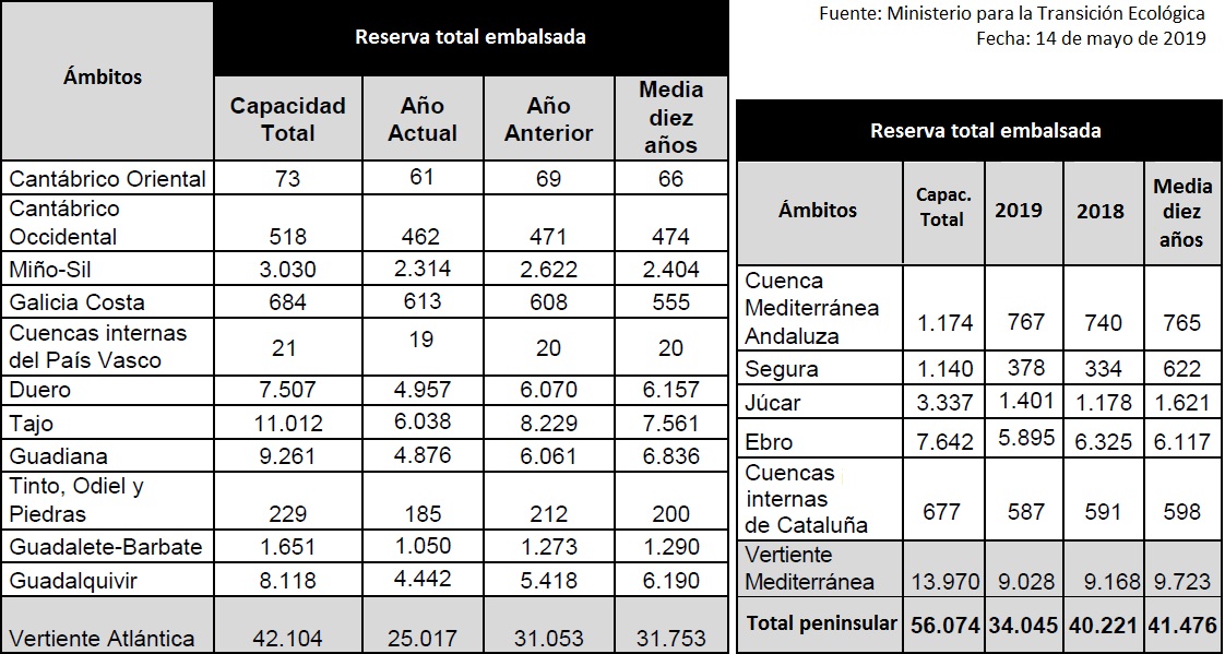 Cantábrico Oriental se encuentra al 83,6%; Cantábrico Occidental al 89,2%; Miño-Sil al 76,4%; Galicia Costa al 89,6%; Cuencas internas del País Vasco al 90,5%; Duero al 66,0%; Tajo al 54,6%; Guadiana al 52,7%; Tinto, Odiel y Piedras al 80,8%; Guadalete-Barbate al 63,6%; Guadalquivir al 54,7%; Cuenca Mediterránea Andaluza al 65,3%; Segura al 33,2%; Júcar al 42,0%; Ebro al 77,1%; Cuencas internas de Cataluña al 86,7%.