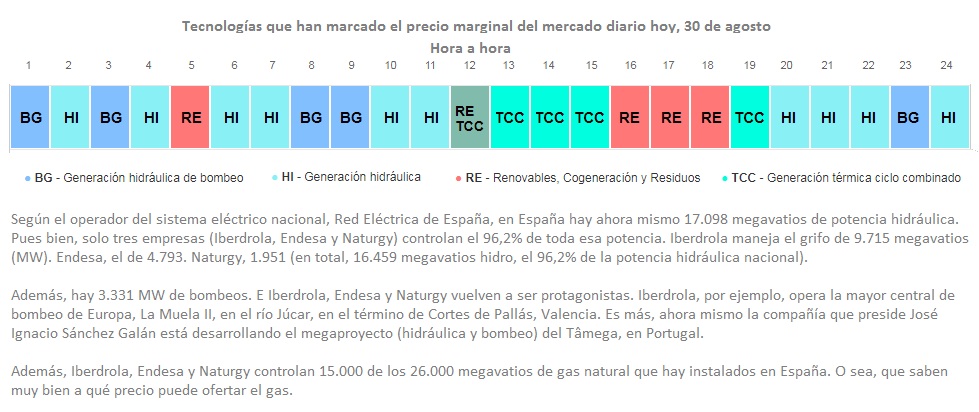 ¿Otro resultado? Todos los generadores están contentos (unos más que otros, pero todos contentos): el gas (porque repercute en ese precio sus costes crecientes: combustible y CO2), las renovables (las que participan en ese mercado, porque hay muchas renovables que tienen un precio previo tasado y no participan ahí) y, por fin, la nuclear (que produce aproximadamente el 20% de la electricidad que usa cada año este país) y la gran hidráulica (que produce aproximadamente el 15%).