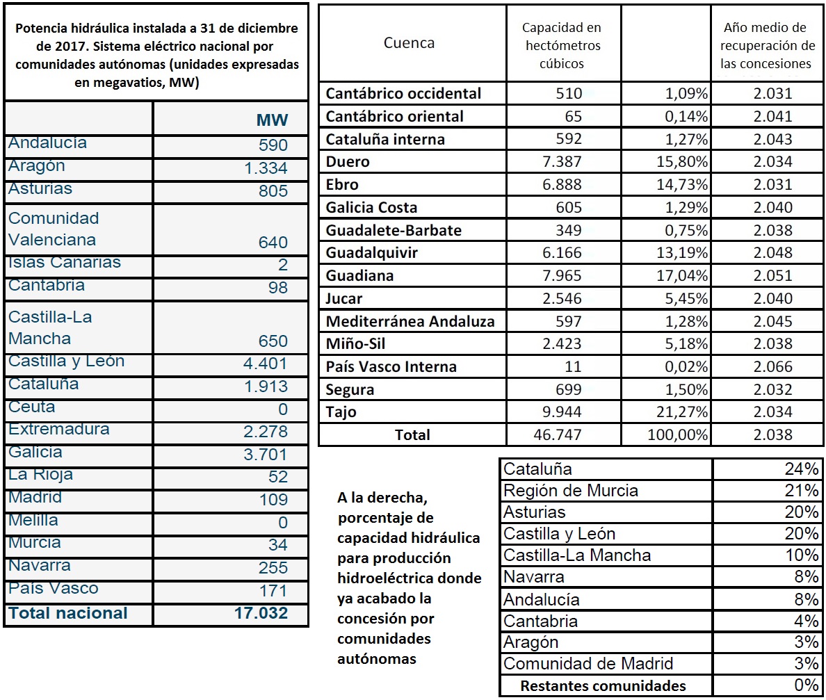 A continuación, fotografía (a 31 de diciembre de 2017), del parque hidroeléctrico español: potencia hidro en megavatios por comunidad autónoma; capacidad en hectómetros cúbicos por cuenca; y año medio de recuperación de las concesiones. Abajo, a la derecha, porcentaje de capacidad hidráulica (por comunidad autónoma) donde ya ha acabado la concesión.