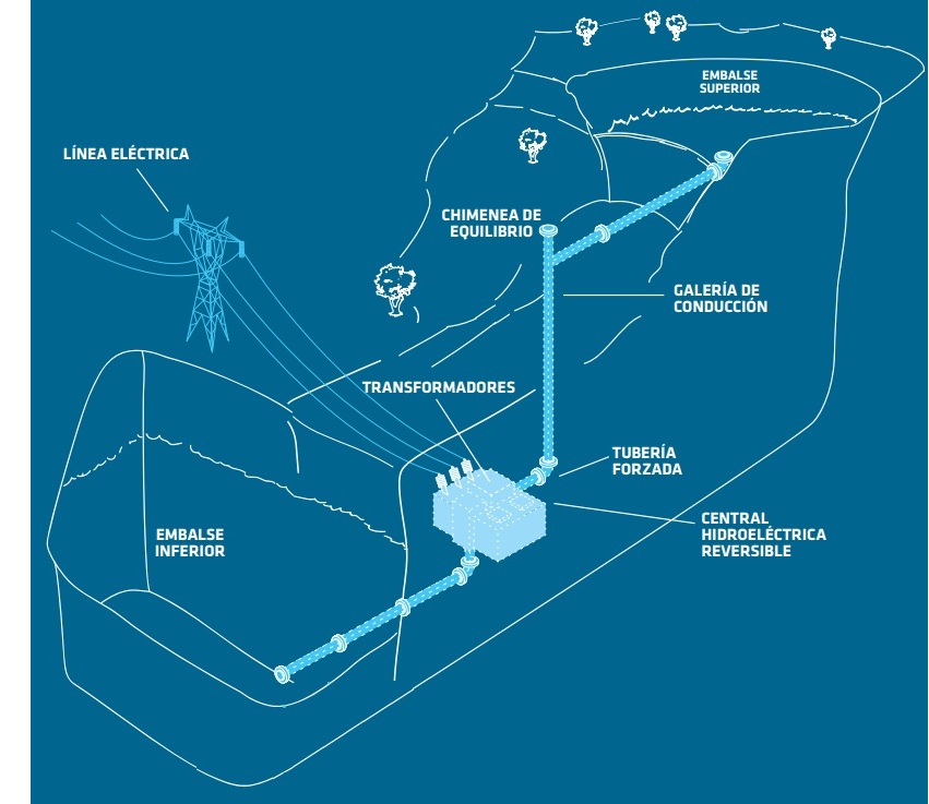 Es una instalación de almacenamiento de energía que tiene dos embalses de agua, a cotas diferentes. Este tipo de centrales puede funcionar en dos modos diferentes: bombeo y turbinación.