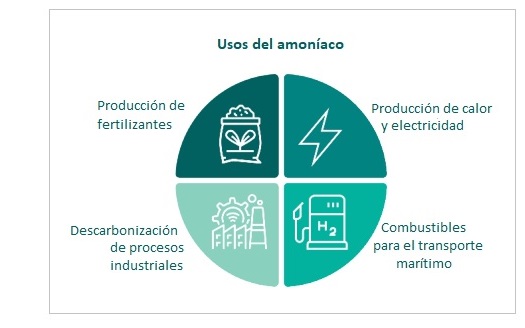 Más allá de sus usos tradicionales (más allá de su uso como precursor de fertilizantes, por ejemplo), el sector productor de amoniaco postula el NH₃ renovable como combustible marino, como portador de hidrógeno y como generador de energía "en países con limitaciones de crecimiento en renovables".