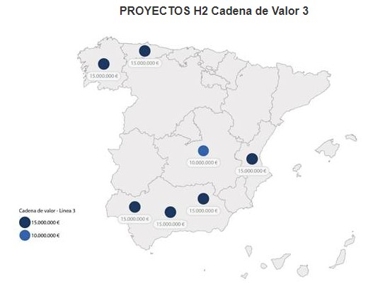 El Ministerio para la Transición Ecológica y el Reto Demográfico (Miteco) ha concedido 100 millones de euros en ayudas a proyectos innovadores de grandes electrolizadores para la producción de hidrógeno renovable, correspondientes a la Línea 3 del Programa H2 Cadena de Valor. Gestionado por el Instituto para la Diversificación y el Ahorro de la Energía (IDAE), el programa ha adjudicado ayudas por importes de 10 y de 15 millones a siete proyectos en cinco comunidades autónomas: Andalucía (3), Comunidad Valenciana, Asturias, Galicia y Castilla-La Mancha. Un total de 60 millones han correspondido a iniciativas en zonas de Transición Justa y Reto Demográfico, como los entornos de las antiguas centrales térmicas de Carboneras (Almería), Meirama (A Coruña), o del complejo termoeléctrico de Aboño (Asturias), entre otros. El programa está incluido en el Proyecto Estratégico para la Reconstrucción y la Transformación Económica de Energías Renovables, Hidrógeno Renovable y Almacenamiento (Perte Erha) y busca impulsar tanto el desarrollo de demostradores de electrólisis como iniciativas de integración real de electrolizadores de gran capacidad en entornos industriales.