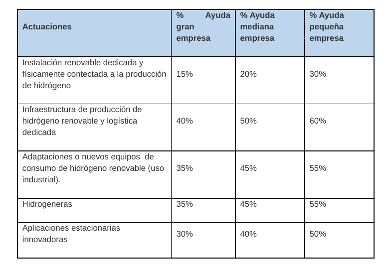 La ayuda total por proyecto está limitada a 15 millones, de acuerdo al Reglamento (UE) 651/2014 de la Comisión, de 17 de junio de 2014 (RGEC), y la intensidad máxima a conceder para cada una de las actuaciones será la siguiente (las ayudas a vehículos propulsados por hidrógeno se podrán consultar en la convocatoria):