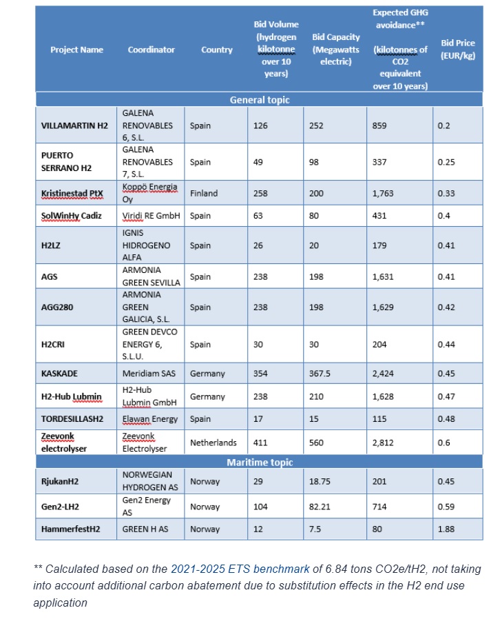Los quince proyectos adjudicatarios se reparten por cinco países y la Comisión estima producirán casi 2,2 millones de toneladas de hidrógeno renovable en diez años, lo que hará posible evitar la emisión de quince millones de toneladas de CO₂. El hidrógeno será empleado en sectores como el transporte, la industria química o para la producción de metanol o amoníaco. Los proyectos ahora adjudicatarios recibirán un total de 992 millones de euros en fondos UE, que saldrán del Fondo para la Innovación (Innovation Fund), que se alimenta del sistema de comercio de emisiones de la Unión Europea (EU Emissions Trading System, ETS). La suma de ayudas que podrán recibir los proyectos ubicados en suelo español asciende a 292,2 millones de euros, la mayor cifra entre los demás países beneficiarios en esta segunda subasta: Alemania, Finlandia, Noruega y Países Bajos.