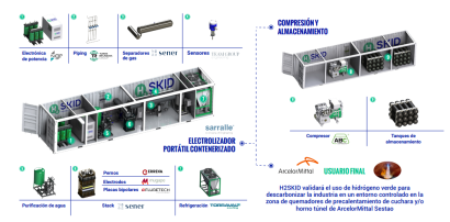 El electrolizador H2SKID se concibe como una plataforma experimental compacta, modular y “plug & play”, integrada en dos módulos contenerizados: uno dedicado a la producción de hidrógeno mediante electrólisis y otro a su compresión y almacenamiento. La solución será compatible con tecnologías de electrólisis AEM y PEM, lo que le confiere una elevada flexibilidad tecnológica. Asimismo, el sistema funcionará como banco de ensayos para la validación de componentes críticos tanto del electrolizador como del compresor. La solución H2SKID será validada en un entorno industrial real, concretamente en la zona de los quemadores de precalentamiento de cuchara y/o del horno túnel de ArcelorMittal Sestao, garantizando así la relevancia práctica de los resultados obtenidos. Al término del proyecto, H2SKID se consolidará como una herramienta científicotecnológica de referencia para impulsar el desarrollo del sector del hidrógeno en Euskadi y acelerar la descarbonización de la industria.