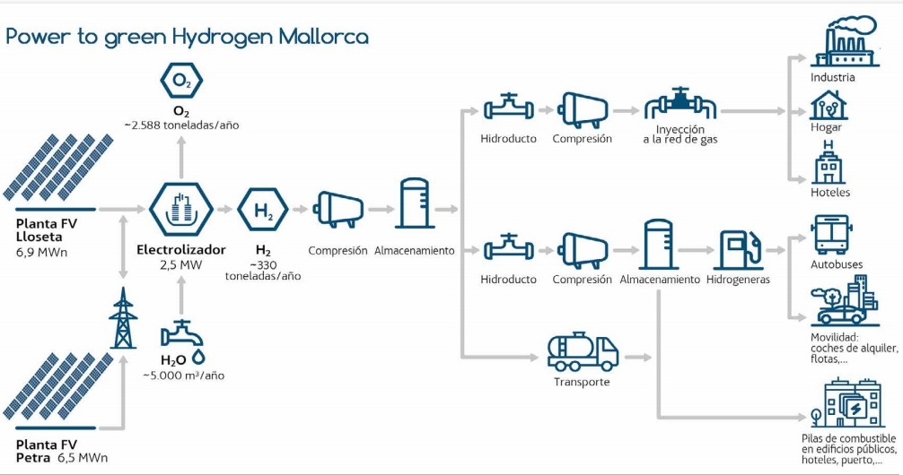 El proyecto industrial Power to Green Hydrogen Mallorca (proyecto de producción a escala industrial de hidrógeno renovable, hasta 7,5 MW de electrólisis) es el núcleo de Green Hysland, una iniciativa europea a través de la cual la UE ha comprometido 10 millones de euros. El proyecto surge como una oportunidad de reindustrialización a partir del cese de actividad de una cementera (Cemex) en Lloseta. El objetivo de Power to Green Hydrogen Mallorca es producir más de 300 toneladas de hidrógeno renovable al año con la energía que generen dos parques fotovoltaicos situados en los municipios de Lloseta y Petra. El hidrógeno servirá como combustible en autobuses y vehículos de alquiler, que podrán repostar en una estación de servicio -hidrogenera- construida a tal efecto. Así mismo, será empleado para la generación de calor y energía para edificios comerciales y públicos, o como energía auxiliar en ferris y operaciones portuarias. Además, parte de ese hidrógeno verde se inyectará en la red de gas de la isla con el apoyo de Redexis (que va a construir el que pasa por ser el primer hidroducto de España) y a través de un Sistema de Garantías de Origen desarrollado por Acciona. Enagás y Acciona lideran el proyecto.