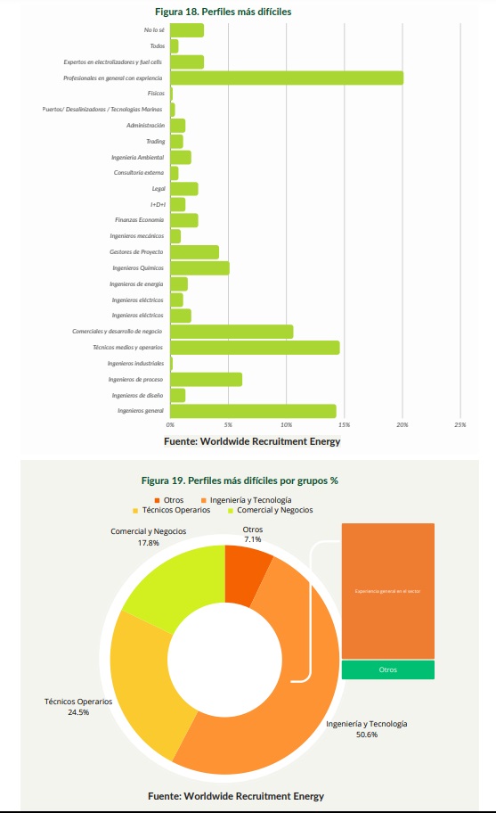 Uno de los datos que parece apuntar esta segunda edición es una progresiva transición de proyectos “sobre el papel” a proyectos “sobre el terreno”. La creciente demanda e interés por perfiles “duros” especializados en la ejecución, instalación o mantenimiento de los proyectos, apunta en esta dirección. Asimismo se aprecia la necesidad de contar con profesionales que solo serán necesarios en estas fases avanzadas de los proyectos como especialistas en electrolizadores, compras y logística, tuberías, electromecánicos seguridad, mantenimiento, transporte, software o simplemente directivos y gestores de proyecto que puedan gestionar estas fases.