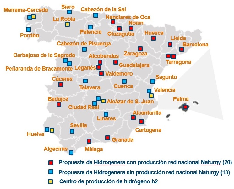Las 38 hidrogeneras estarían distribuidas a lo largo de la geografía nacional, aprovechando los centros de producción de hidrógeno de la compañía, ubicados en La Robla, Meirama, Valencia, Palos y Alcázar de San Juan. De estas 38, seis estarían ubicadas en Andalucía; cinco en Castilla-la Mancha; cuatro en Castilla y León y en Cataluña; tres en la Comunidad de Madrid; dos en Galicia, Comunidad Valencia, la Región de Murcia, Aragón, Navarra y Extremadura; y una en Baleares, Asturias, Cantabria y País Vasco.
