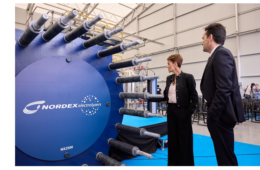 Nordex Electrolyzers, empresa ubicada en Lumbier (y de la que es accionista la sociedad pública navarra Sodena) ha presentado hoy al Gobierno foral el electrolizador, primero de escala megavatio “íntegramente diseñado y fabricado en España”. Se trata del modelo NX2500, de 2,5 MW y ha sido fruto –según el Ejecutivo navarro– de la colaboración público–privada (Nordex es una compañía multinacional de origen alemán que desarrolla y fabrica aerogeneradores y que así mismo opera como promotora eólica en determinados mercados).