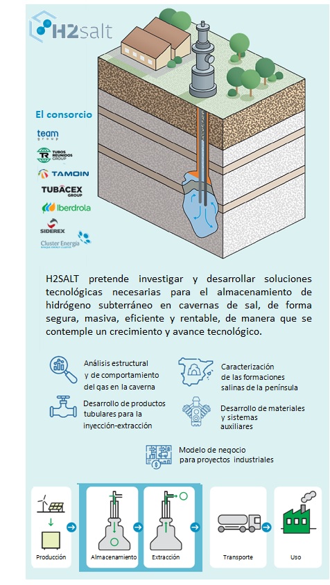 El proyecto de corredor europeo de hidrógeno que impulsa el Gobierno de España para conectar la península ibérica con Europa plantea la construcción de un gran almacén de hidrógeno en Euskadi. Este almacén -explican desde el consorcio- es un elemento considerado "infraestructura facilitadora" para (1) mantener el flujo del hidroducto y para (2) acoplar la producción de hidrógeno renovable al perfil de consumo de las industrias que utilizarán este gas verde para descarbonizarse. Pues bien, en ese marco, varias empresas vascas (y la multinacional Iberdrola) se están posicionando en la carrera para la gestión de ese depósito de hidrógeno que se instalará aprovechando las cavidades salinas de la orografía de Euskadi. Se trata concretamente de los fabricantes de tubos Tubacex y Tubos Reunidos, las ingenierías Team Group y Tamoin y la multinacional Iberdrola (cuyo principal accionista es el fondo soberano de Catar). El consorcio que han formado todos estos agentes ya está trabajando en el desarrollo de un sistema de gestión del almacenamiento de hidrógeno en esas cavidades salinas. Este desarrollo -explican desde el propio consorcio- se enmarca en el proyecto H2Salt, que busca desarrollar un sistema para la gestión integral del almacenamiento de hidrógeno en cavernas salinas y validar su viabilidad técnico-económica. Los resultados serían de aplicación al almacén que el operador contempla para Euskadi y para otras iniciativas estatales y europeas.