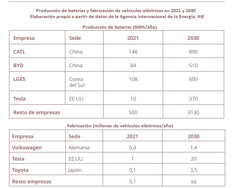 La industria de las baterías y el vehículo eléctrico en todo caso -explican desde ODG- está experimentando "cambios rápidos", con nuevos actores que entran en la actividad, y otros, tradicionales, que buscan expandirse. La cartera de nuevos proyectos está dominada por las empresas chinas CATL y BYD, la compañía estadounidense Tesla y la surcoreana LG Energy Solutions (LGES), que, en suma, constituyen el 40% del total de proyectos (véase bajo estas líneas la tabla que ODG también ha incluido en La mina, la fábrica y la tienda).