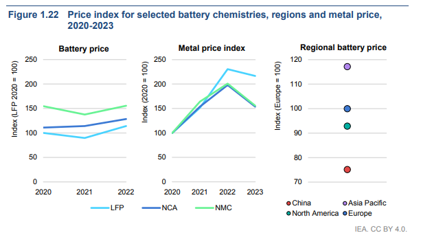 En cuanto al precio, también varía según las regiones: China tiene los precios más bajos por término medio y el resto de la región Asia-Pacífico, los más altos. Esta discrepancia de precios se debe a que alrededor del 65% de las pilas y casi el 80% de los cátodos se fabrican en China. de las pilas y casi el 80% de los cátodos se fabrican en China.