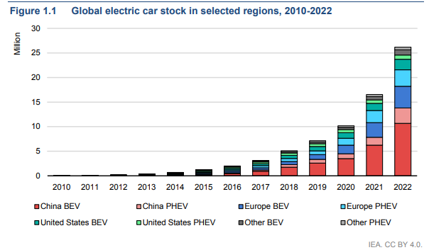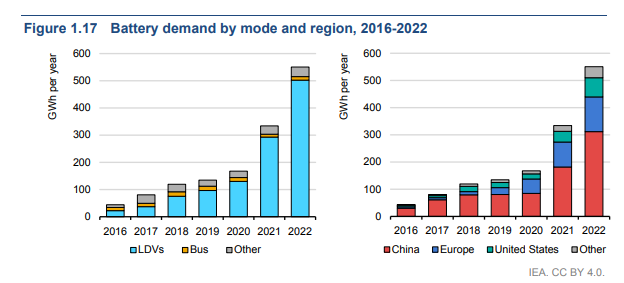 En resumen, hoy, más de la mitad de todos los automóviles eléctricos en circulación en todo el mundo están en China. Europa y Estados Unidos, el segundo y tercer mercado más grande, experimentaron un fuerte crecimiento con ventas que aumentaron un 15 % y un 55 % respectivamente en 2022. Se espera que los ambiciosos programas de políticas en las principales economías, como el paquete Fit for 55 en la Unión Europea y la Ley de Reducción de la Inflación en los Estados Unidos, aumenten aún más la participación de mercado de los vehículos eléctricos en esta década y más allá. Para 2030, la participación promedio de los coches eléctricos en las ventas totales en China, la UE y los Estados Unidos aumentará a alrededor del 60%.