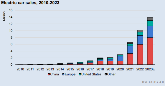 Las ventas globales de coches eléctricos alcanzarán otro récord este año, ampliando su participación en el mercado en general a cerca de una quinta parte y liderando una gran transformación de la industria, según la nueva edición de Global Electric Vehicle Outlook anual de la IEA, que muestra que se vendieron más de 10 millones de coches eléctricos en todo el mundo en 2022 y que se espera que las ventas crezcan otro 35% este año para llegar a 14 millones. Este crecimiento explosivo significa que la participación de los automóviles eléctricos en el mercado general de automóviles ha aumentado de alrededor del 4 % en 2020 al 14 % en 2022 y se espera que aumente aún más hasta el 18 % este año, según las últimas proyecciones de la AIE. A escala mundial, la estimación actual es, por tanto, de casi 14 millones de coches eléctricos vendidos en 2023, sumándose a los más de 2,3 millones ya vendidos en el primer trimestre del año. Esto representa un aumento del 35% en las ventas de coches eléctricos en 2023 en comparación con 2022 y situaría la cuota mundial de ventas de coches eléctricos en torno al 18%, frente al 14% en 2022.