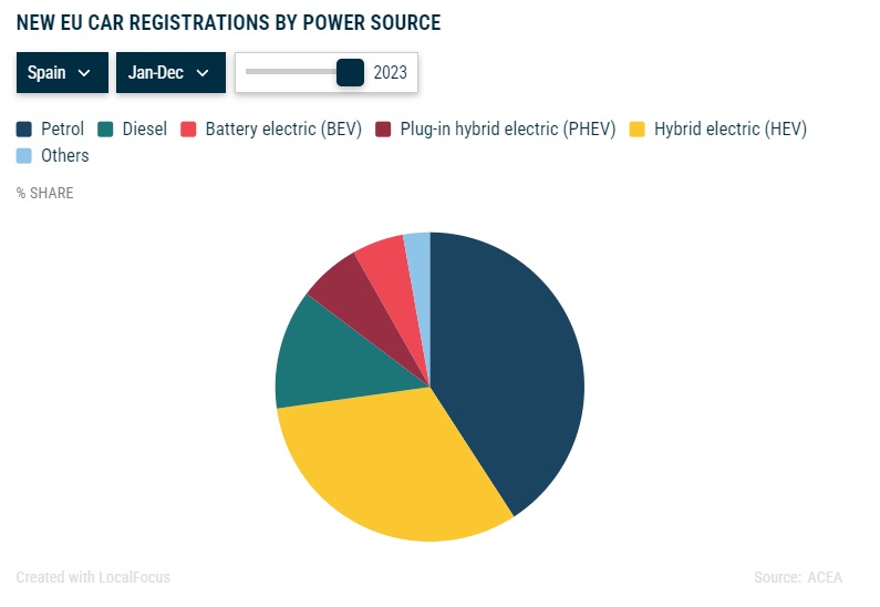 Desde su entrada en el mercado, los vehículos eléctricos han sido más caros que los de combustión interna debido a varios factores, tales como el coste de la tecnología de baterías y la falta de economías de escala en la producción. Aunque en los últimos años, hemos sido testigos de una notable reducción en el precio de las baterías, sigue siendo necesario invertir en investigación y desarrollo para continuar reduciendo sus costes y mejorar su eficiencia. Aunque la tecnología de las baterías ha mejorado significativamente, todavía existen limitaciones en cuanto a la autonomía y el tiempo de carga, por lo que se hace imprescindible seguir avanzando en desarrollar baterías con mayor capacidad y tiempos de carga más rápidos. [Junto a estas líneas, matriculaciones de vehículos por tipo de propulsión en España en 2023. Fuente: ACEA]