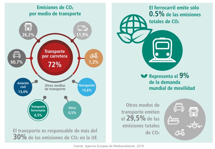 Mafex acaba de publicar un documento de posicionamiento en el que solicita de los poderes públicos un mayor apoyo al ferrocarril para que sea "el eje vertebrador de las políticas y estrategias de transporte nacionales e internacionales a largo plazo". Para la Asociación es indispensable impulsar este transporte para alcanzar los objetivos marcados por la Unión Europea y la comunidad internacional y llegar a ser una economía neutra en carbono para el año 2050. "En este sentido -recuerda-, cabe resaltar que el ferrocarril genera sólo el 0,5% de las emisiones totales de CO2, mientras que otros modos de transporte llegan al 29,5%". El documento publicado por Mafex repasa las "numerosas ventajas medioambientales" que oferta el ferrocarril, "que es el transporte colectivo con menores emisiones por pasajero, presenta una baja tasa de siniestralidad, una alta eficiencia en capacidad y reduce las emisiones de gases de efecto invernadero y otros gases contaminantes (como el NOx y las partículas), así como el ruido, la luminiscencia, etcétera".