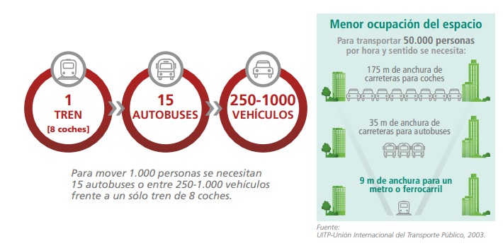 En este sentido, los ferrioviarios exponen que “será necesario también integrar en este ecosistema de la movilidad inteligente a los nuevos agentes que están surgiendo” (en referencia al coche compartido, los aparcamientos disuasorios, la bicicleta eléctrica, el patinete, etc. "Esto deberá llevarse a cabo -concluye Mafex- bajo una perspectiva que ponga al usuario en el centro de los procesos ofreciendo las mejores experiencias de movilidad. Se trata de brindar la solución más eficiente en cada momento integrando datos procedentes de varias fuentes de la infraestructura y la ciudad para una intermodalidad fácil y sencilla". [Bajo estas líneas, a la derecha, una imagen que ilustra otra de las virtudes del ferrocarril, según Mafex, la menor ocupación de espacio].