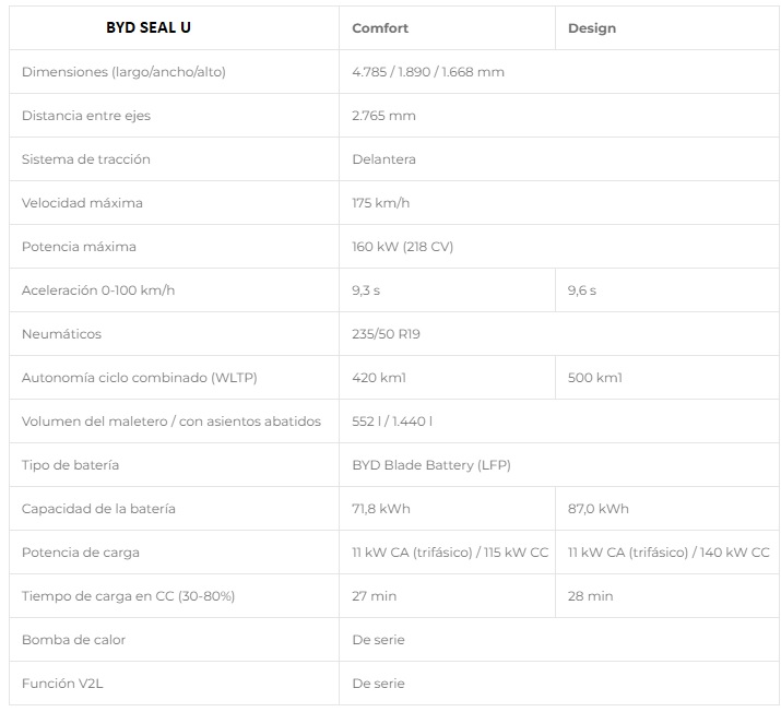 Al igual que el resto de modelos que la marca ofrece en Europa, el BYD Seal U está equipado de serie con la exclusiva Blade Battery de BYD, que prescinde de níquel y cobalto y ha sido desarrollada internamente "con el objetivo principal de optimizar la seguridad, la durabilidad, la longevidad, el rendimiento y el aprovechamiento del espacio de la batería".