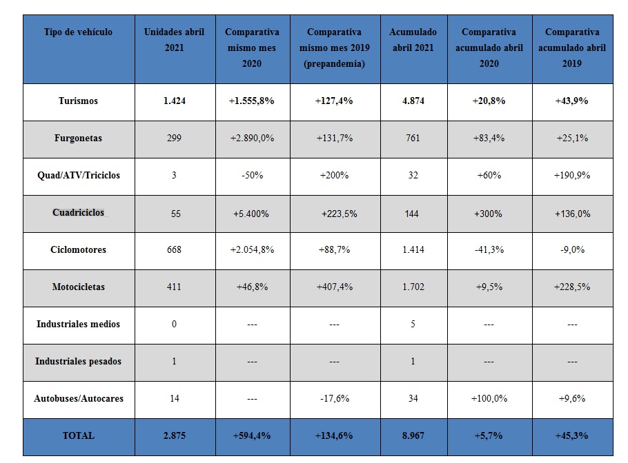 En un análisis por tipo de vehículo, los turismos 100% eléctricos registraron durante el pasado mes un total de 1.424 unidades, lo que supone un 1.555% más; si bien se queda en un descenso del 127,4% comparado con abril de 2019, la referencia pre-pandemia.