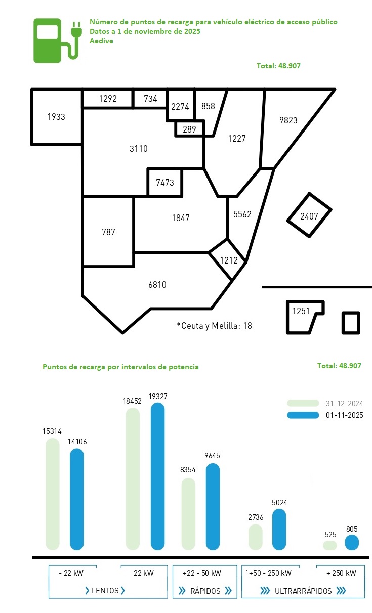 Las infraestructuras de recarga públicas que presentan un mayor crecimiento son las de alta potencia, según Aedive. Los puntos de que van de 50 a 250 kilovatios han ascendido un 83,63%, mientras que los que están por encima de los 250 kW se han incrementado en un 53,33%. La Asociación destaca por otro lado que las infraestructuras de recarga rápida (que van de 22 a 50 kW) también han mostrado un incremento del 15,45% hasta el 1 de noviembre. En lo concerniente al despliegue por comunidades autónomas, Cataluña, Madrid y Andalucía se mantienen como las tres regiones con el mayor número de puntos de recarga. Entre las tres suman casi la mitad del total de las infraestructuras registradas a escala nacional a uno de noviembre del corriente "De este modo -concluye Aedive-, se sigue consolidando la tendencia en claro ascenso en la instalación de puntos de recarga de alta potencia operativos en vías interurbanas".