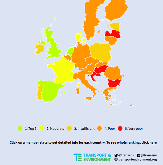 En cuanto a los países peor clasificados, Alemania (puesto 15) ha pospuesto la toma de decisiones hasta que se publique la versión final de su plan (que se debe entregar antes de fin de año). Italia (17) planea impulsar automóviles y camiones propulsados por gas a pesar de que emiten tantos gases de efecto invernadero como los vehículos de gasolina y diésel. Aún peores son los planes de Bulgaria (27), que según T&E no contiene nada para reducir las emisiones de camiones, furgonetas, aviación o transporte marítimo, mientras que Hungría (28) dice que incrementará sus emisiones de transporte en un 30% por encima de los niveles de 2005.