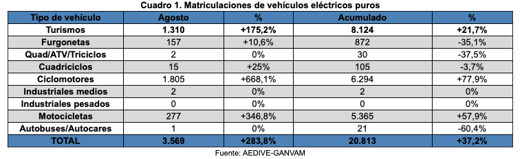 Si nos fijamos solo en los turismos, agosto registró un total de 1.310 unidades matriculadas, lo que supone un 175% más, concentrando ya el 1,9% del total de turismos matriculados. Tras los turismos, el mercado de las dos ruedas se alza como el mayor trampolín para impulsar la movilidad eléctrica. En concreto, el 50,5% de las matriculaciones de eléctricos en agosto correspondieron a ciclomotores, lo que supone un 668% más, con un total de 1.805 unidades matriculadas, de las que el 84% se destinaron a iniciativas de movilidad compartida. Las motocicletas, con 277 unidades matriculadas, subieron un 346% durante el mes pasado.