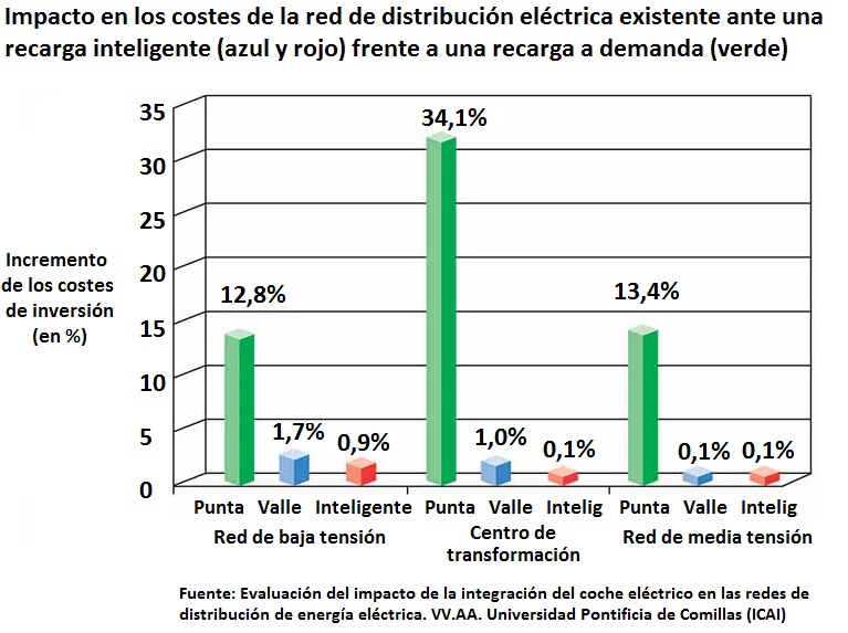 Todavía existen numerosos retos tecnológicos dentro del desarrollo de los vehículos eléctricos, tanto a nivel de componentes del vehículo como en la infraestructura de recarga. No obstante, la tecnología actual ya permite dar una respuesta eficaz a este reto. Además, el sistema eléctrico en España está preparado para integrar el desarrollo masivo de vehículos eléctricos, tanto en capacidad de generación, como en infraestructura eléctrica, eso sí, se necesita que los procesos de recarga de los mismos sea inteligente (ver gráfico).
