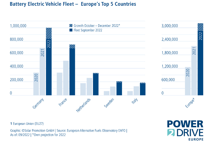Power2Drive Europe, la feria que se celebra entre el 14 y el 16 de junio en el marco de The smarter E Europe 2023, ha lanzado un comunicado en el que prevé que, cuando acabe el año, habrá un millón de coches eléctricos matriculados en Alemania. En la Unión Europea (UE) se superará la marca de los tres millones, según un cálculo aproximado basado en las últimas cifras de la Oficina Federal Alemana de Transportes por Carretera (KBA) y del Observatorio Europeo de Combustibles Alternativos (EAFO). Según el EAFO, en los primeros puestos de la UE en número de coches eléctricos de baterías están también, aparte de Alemania, Francia, con 3/4 de millón, Países Bajos, Suecia e Italia. La electromovilidad es la clave para una movilidad respetuosa con el clima y muchas innovaciones. Según un estudio de la Universidad de las Fuerzas Armadas de Alemania (UniBw) de Múnich, los vehículos eléctricos de batería tienen, con diferencia, el mejor balance de emisiones de gases de efecto invernadero si se cargan, por ejemplo, con el mix energético estándar habitual en Alemania. Además, gracias a sus acumuladores de energía, en el futuro los coches eléctricos podrán compensar las oscilaciones en la generación de energía solar y eólica y, así, ayudar a la expansión e integración en el mercado de las fuentes de energía volátiles. El boom sostenido de los coches eléctricos se debe a la mejora de sus prestaciones y autonomía, los programas de fomento europeos y la ampliación de la infraestructura de carga.